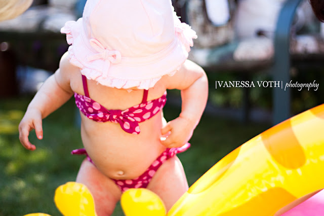 She first came out in her bikini. Yes, a bikini. She got it as a gift at a baby shower when she was a couple months old and I've been waiting to put it on her ever since! It was quite adorable (may as well let her wear it now while it's still cute because once she hits puberty she ain't wearing a bikini anymore!) Being the responsible parent that I am, I put her in a more covering outfit after I got enough pictures of the bikini. Plus, the bikini made it too easy for her to scratch herself.